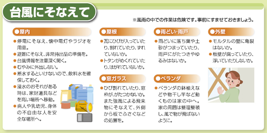 また、台風の時は風が大変強くなりますので、雨の降り方が通常とは異なります。普段、雨漏りをしていなくても、台風の時に限って漏ることもありますので注意深く見て下さいね