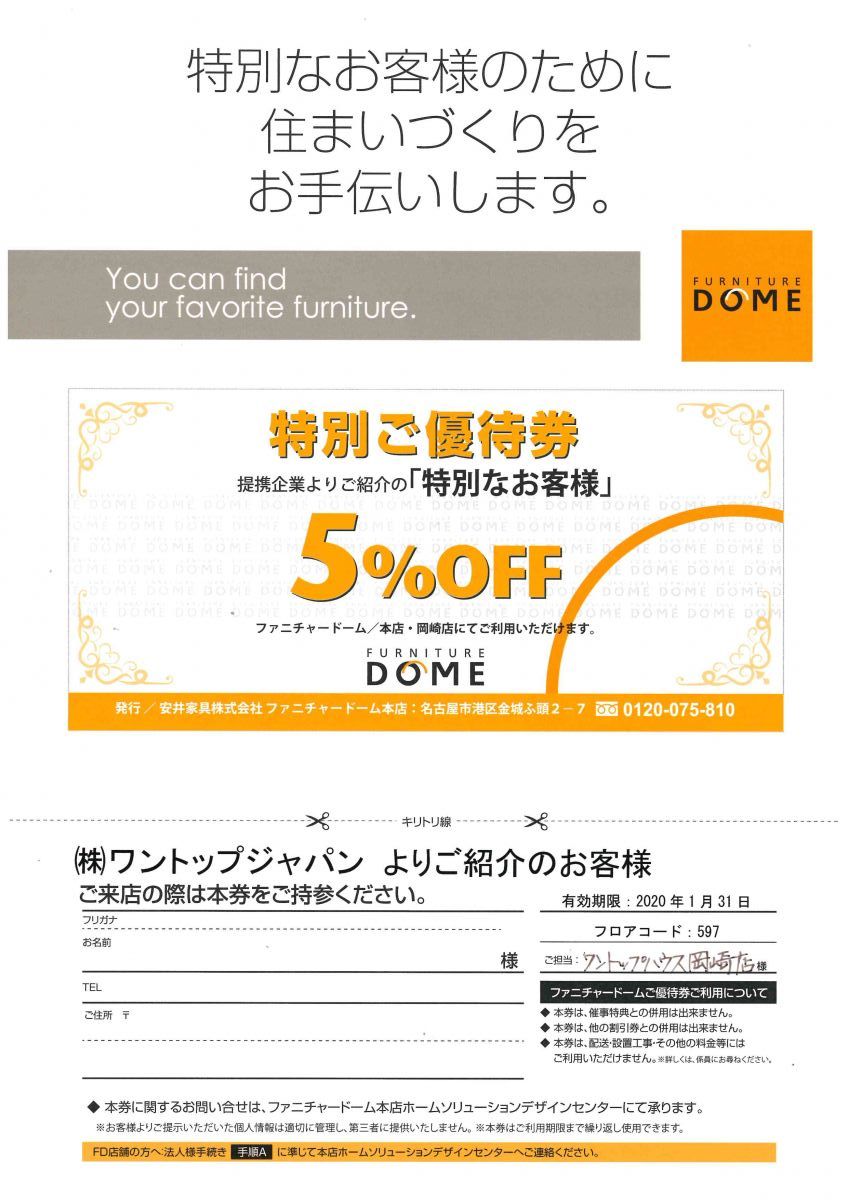 ファニチャードームの特別ご優待券 ワントップハウス店頭に