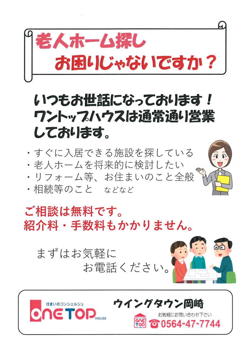 【あなたにあった老人ホームお探しします】あなたにあった老人ホームお探しします_ワントップハウスウイングタウン岡崎店【空き家相談もワントップにお任せください!】