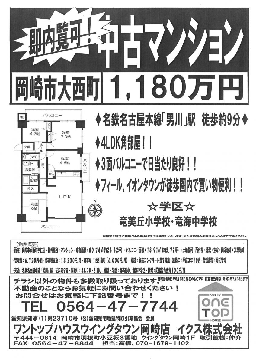 安城市 岡崎市 豊田市 刈谷市 幸田町 マンション 大西町 4LDK 角部屋 3面バルコニー 不動産 物件紹介 ワントップハウス ウイングタウン 土地 戸建 売買 賃貸 新築 中古 査定 相談無料 老人ホーム相談 手数料無料