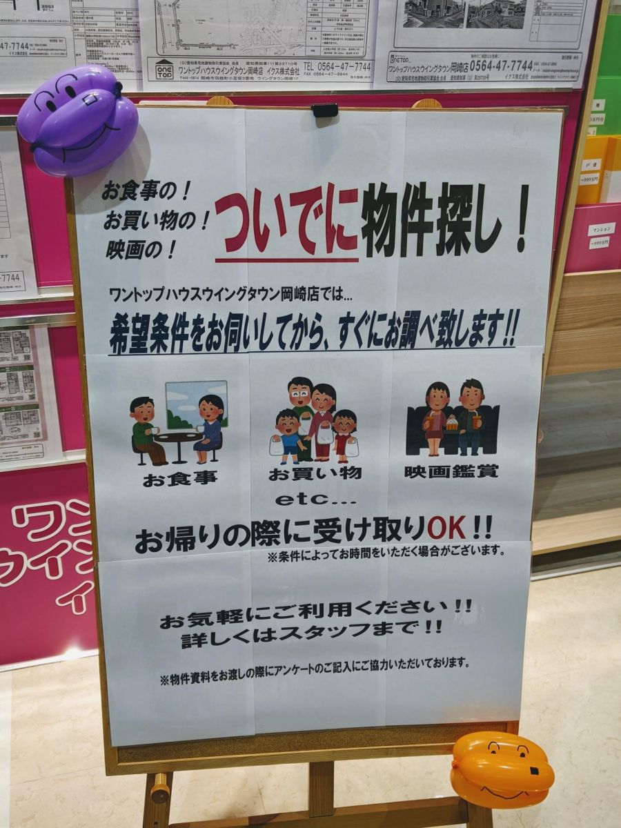 映画の!ついでに物件探しキャンペーンを実施中です。ワントップハウスウイングタウン岡崎店では、ご希望の条件お伺いしてからすぐにお調べ致します!