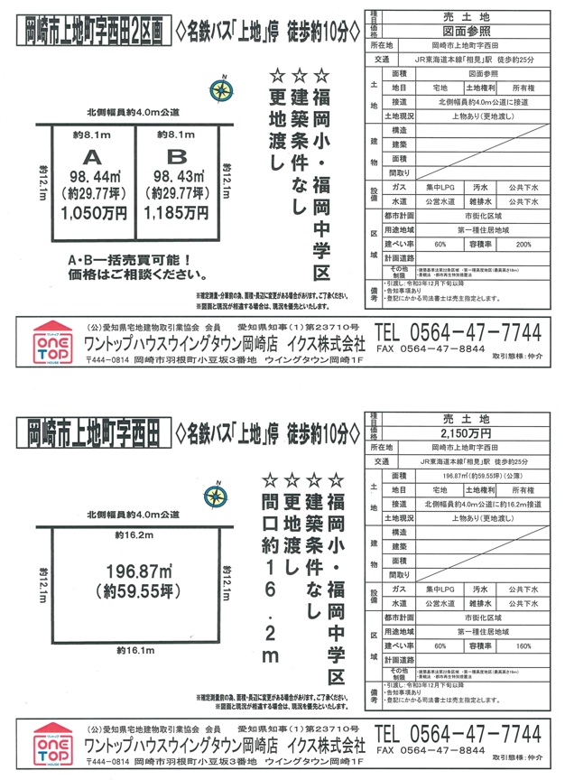 安城市 岡崎市 豊田市 刈谷市 幸田町 不動産 ワントップハウス ウイングタウン 土地 戸建 売買 賃貸 新築 中古 査定 相談無料 老人ホーム相談 手数料無料 岡崎市不動産 岡崎市上地町 相見駅 建築条件なし 更地渡し 整形地 福岡小学校 福岡中学校