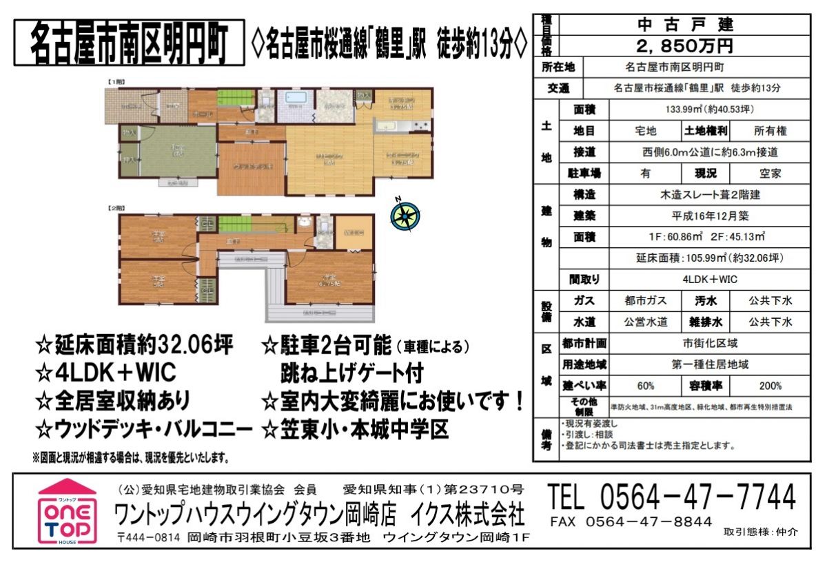 安城市 岡崎市 豊田市 刈谷市 幸田町 不動産 ワントップハウス ウイングタウン 土地 戸建 売買 賃貸 新築 中古 査定 相談無料 老人ホーム相談 手数料無料 名古屋市 南区 明円町 中古戸建 4LDK 笠東小 本城中