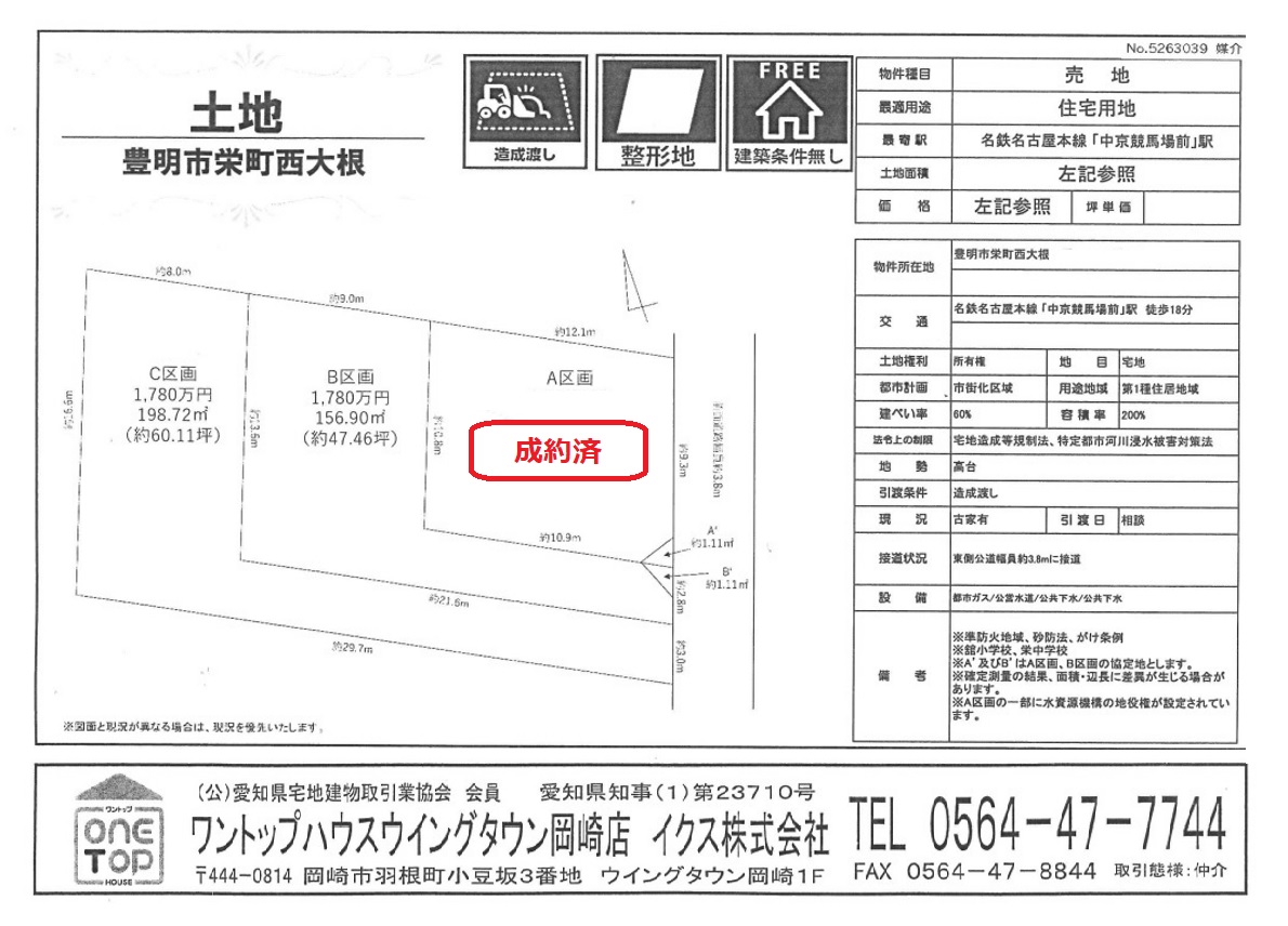 安城市 岡崎市 豊田市 刈谷市 幸田町 不動産 ワントップハウス ウイングタウン 土地 戸建 売買 賃貸 新築 中古 査定 相談無料 老人ホーム相談 手数料無料 豊明市栄町西大根 建築条件なし 土地 売土地 造成渡し 舘小学校 栄中学校