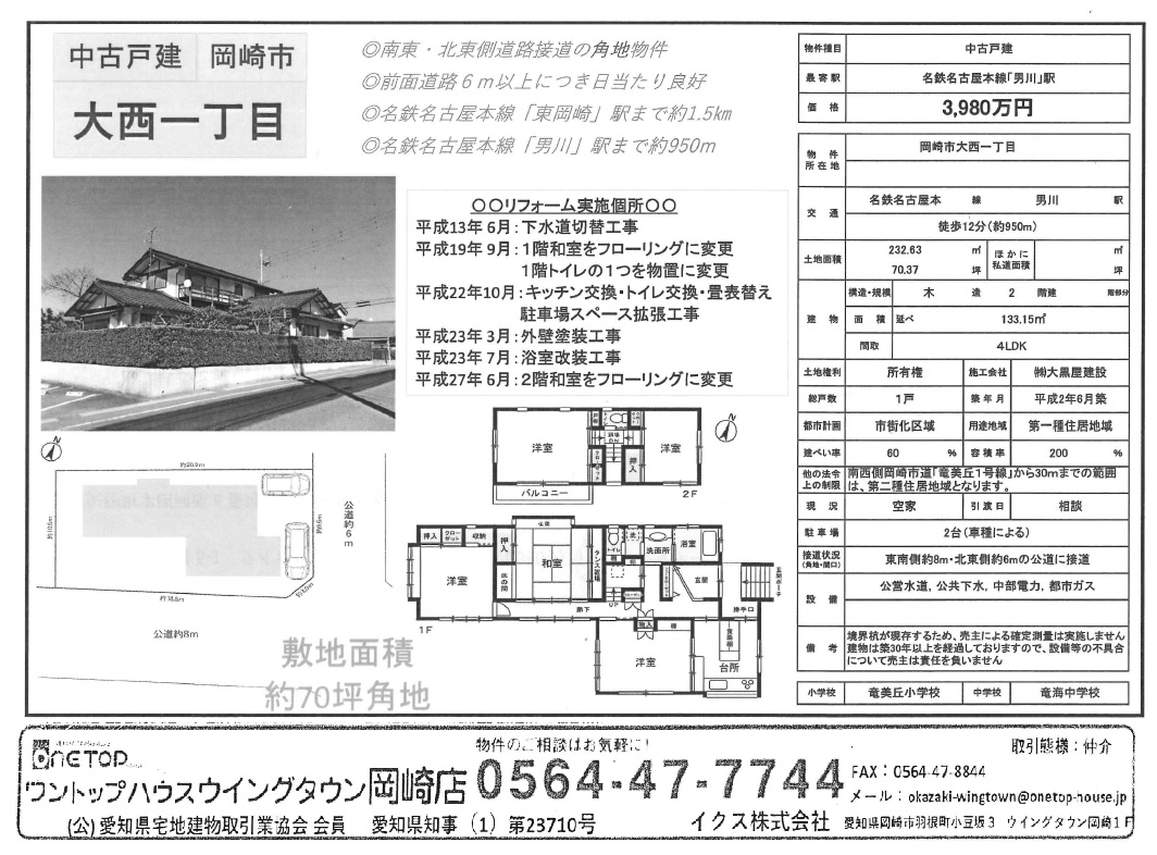 安城市 岡崎市 豊田市 刈谷市 幸田町 不動産 ワントップハウス ウイングタウン 土地 戸建 売買 賃貸 新築 中古 査定 相談無料 老人ホーム相談 手数料無料 岡崎市不動産 岡崎市戸建 岡崎市マンション 岡崎市土地 名鉄名古屋本線 男川駅 竜美丘小学校 竜海中学校
