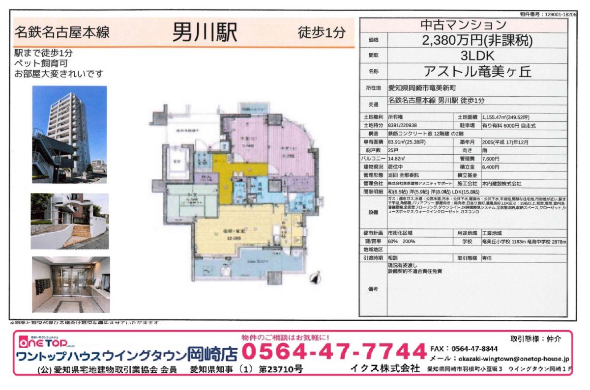 安城市 岡崎市 豊田市 刈谷市 幸田町 不動産 ワントップハウス ウイングタウン 土地 戸建 売買 賃貸 新築 中古 査定 相談無料 老人ホーム相談 手数料無料 岡崎市不動産 岡崎市戸建 岡崎市マンション 岡崎市竜美新町 名鉄名古屋本線 男川駅 竜美丘小学校 竜海中学校