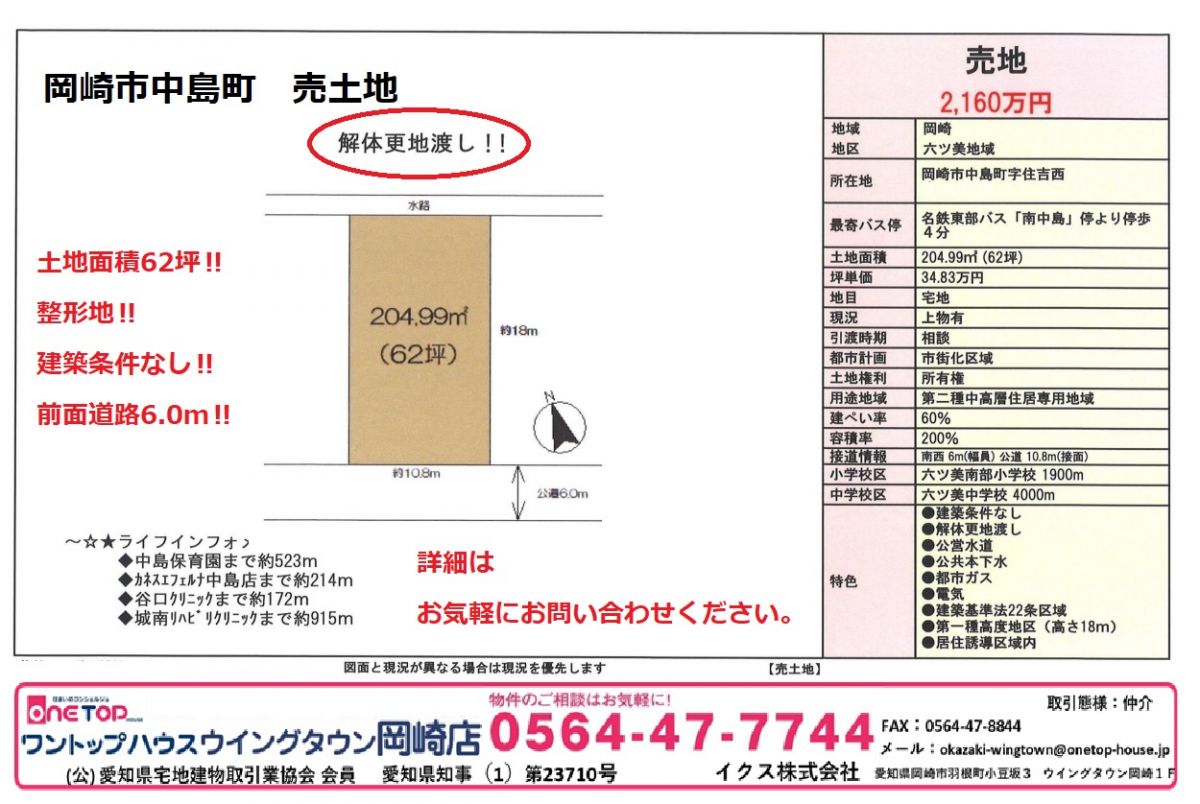 安城市 岡崎市 豊田市 刈谷市 幸田町 不動産 ワントップハウス ウイングタウン 土地 戸建 売買 賃貸 新築 中古 査定 相談無料 老人ホーム相談 手数料無料 岡崎市不動産 岡崎市中島町 建築条件なし 六ッ美南部小学校 六ッ美中学校