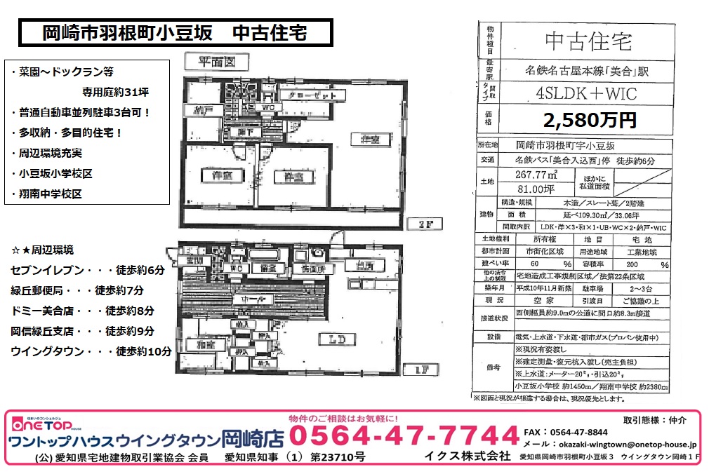 安城市 岡崎市 豊田市 刈谷市 幸田町 不動産 ワントップハウス ウイングタウン 土地 戸建 売買 賃貸 新築 中古 査定 相談無料 老人ホーム相談 手数料無料 岡崎市不動産 岡崎市羽根町 中古住宅 名鉄名古屋本線 美合駅 小豆坂小学校 翔南中学校