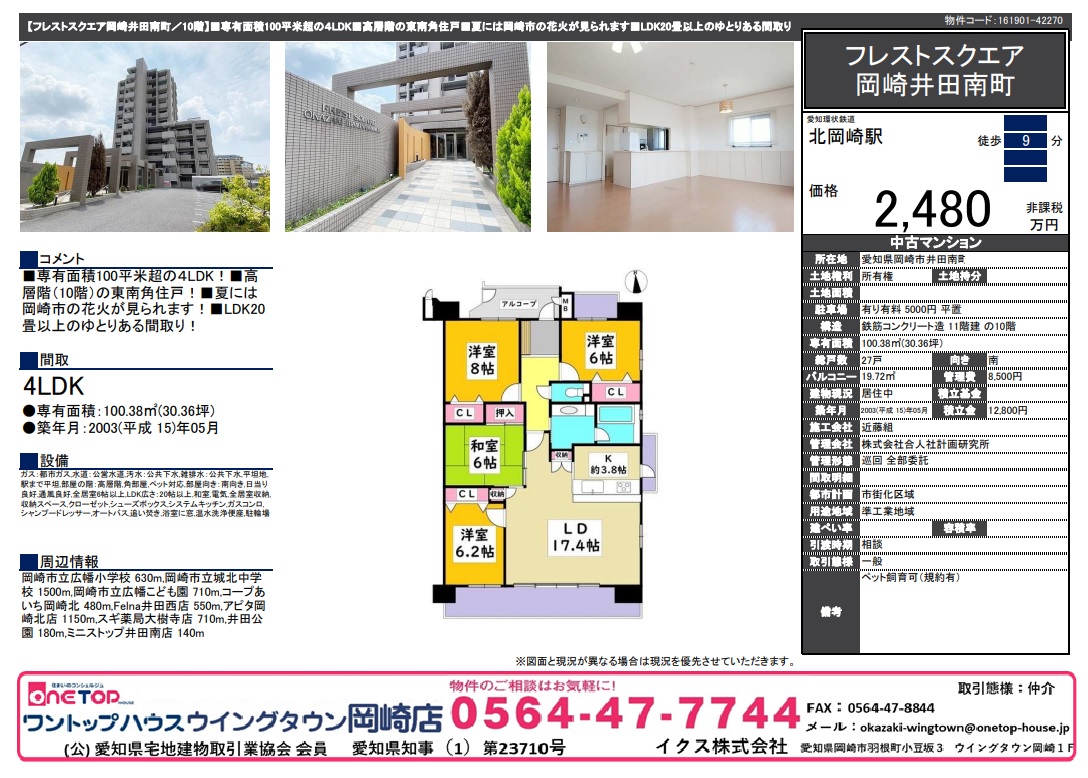 安城市 岡崎市 豊田市 刈谷市 幸田町 不動産 ワントップハウス ウイングタウン 土地 戸建 売買 賃貸 新築 中古 査定 相談無料 老人ホーム相談 手数料無料 岡崎市不動産 岡崎市戸建 岡崎市マンション 岡崎市井田南町 フレストスクエア井田南町 広幡小学校 城北中学校