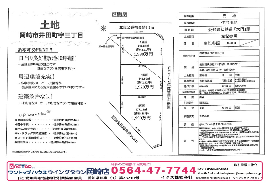 安城市 岡崎市 豊田市 刈谷市 幸田町 不動産 ワントップハウス ウイングタウン 土地 戸建 売買 賃貸 新築 中古 査定 相談無料 老人ホーム相談 手数料無料 岡崎市不動産 岡崎市売土地 建築条件なし 岡崎市井田町 井田小学校 葵中学校区