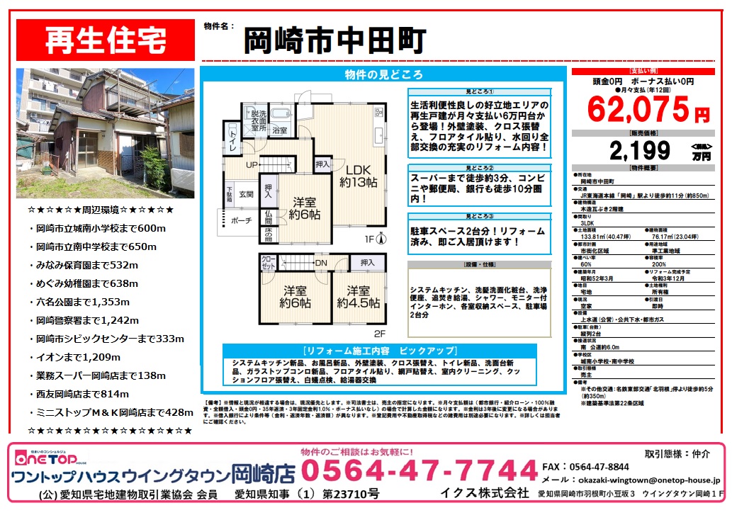 安城市 岡崎市 豊田市 刈谷市 幸田町 不動産 不動産仲介 不動産会社 ワントップハウス 不動産仲介 不動産売買 不動産売却 不動産屋 ウイングタウン 土地 戸建 売買 売買物件 媒介 賃貸 新築 中古 土地探し 査定 土地購入 売却相談 相談無料 老人ホーム相談 岡崎市土地紹介 岡崎市不動産 岡崎市新築 建売 築浅 築浅物件 築浅マンション リフォーム済マンション 岡崎市新築戸建 岡崎市新築戸建て 岡崎市中古戸建 岡崎市中古戸建て 岡崎市中古マンション 岡崎市築浅マンション 手数料無料 岡崎市中田町 再生住宅 城南小学校 南中学校