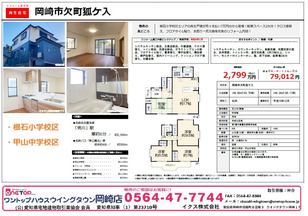 安城市 岡崎市 豊田市 刈谷市 幸田町 不動産 不動産仲介 不動産会社 ワントップハウス 不動産仲介 不動産営業 不動産売却 不動産屋 ウイングタウン 土地 戸建 売買 売買物件 媒介 賃貸 新築 中古 土地探し 査定 土地購入 売却相談 相談無料 老人ホーム相談 建築条件なし 土地紹介 岡崎市不動産 岡崎市新築 建売 築浅 築浅物件 築浅マンション 新築戸建 新築戸建て 中古戸建 中古戸建て 中古マンション 築浅マンション 手数料無料 岡崎市 再生住宅 岡崎市欠町中古住宅 根石小学校区 甲山中学校区 駐車並列2台可