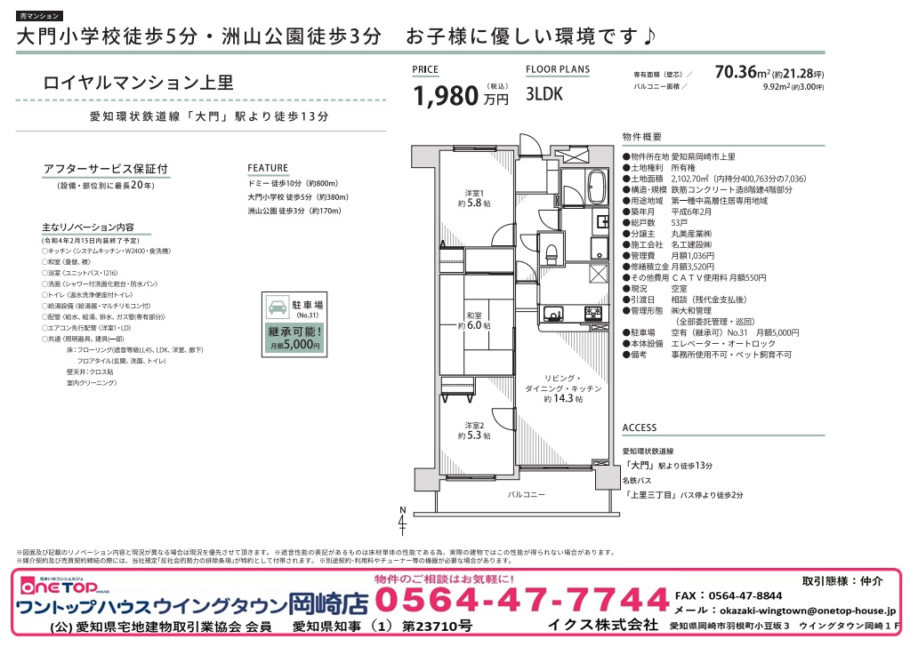 安城市 岡崎市 豊田市 刈谷市 幸田町 不動産 不動産仲介 不動産会社 ワントップハウス 不動産仲介 不動産営業 不動産売却 不動産屋 ウイングタウン 土地 戸建 売買 売買物件 媒介 賃貸 新築 中古 土地探し 査定 土地購入 売却相談 相談無料 老人ホーム相談 建築条件なし 土地紹介 岡崎市不動産 岡崎市新築 建売 築浅 築浅物件 築浅マンション 新築戸建 新築戸建て 中古戸建 中古戸建て 中古マンション 築浅マンション 手数料無料 岡崎市上里 ロイヤルマンション上里 愛知環状鉄道 大門駅 大門小学校 北中学校