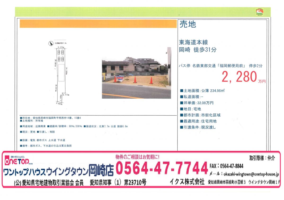 ■福岡小学校徒歩圏内! ■JR東海道本線「岡崎」駅徒歩約31分! ・用途地域 近隣商業 市街化区域 ・建ぺい率 80% ・容積率 200% ・土地面積 234.98㎡(約71.08坪)
