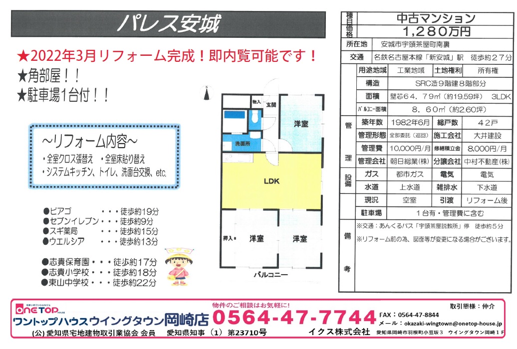 新築 中古 土地探し 査定 土地購入 売却相談 相談無料 老人ホーム相談 建築条件なし 土地紹介 中古マンション 安城市マンション パレス安城 名鉄名古屋本線 新安城駅 角部屋 志貴小学校 東山中学校 リフォーム