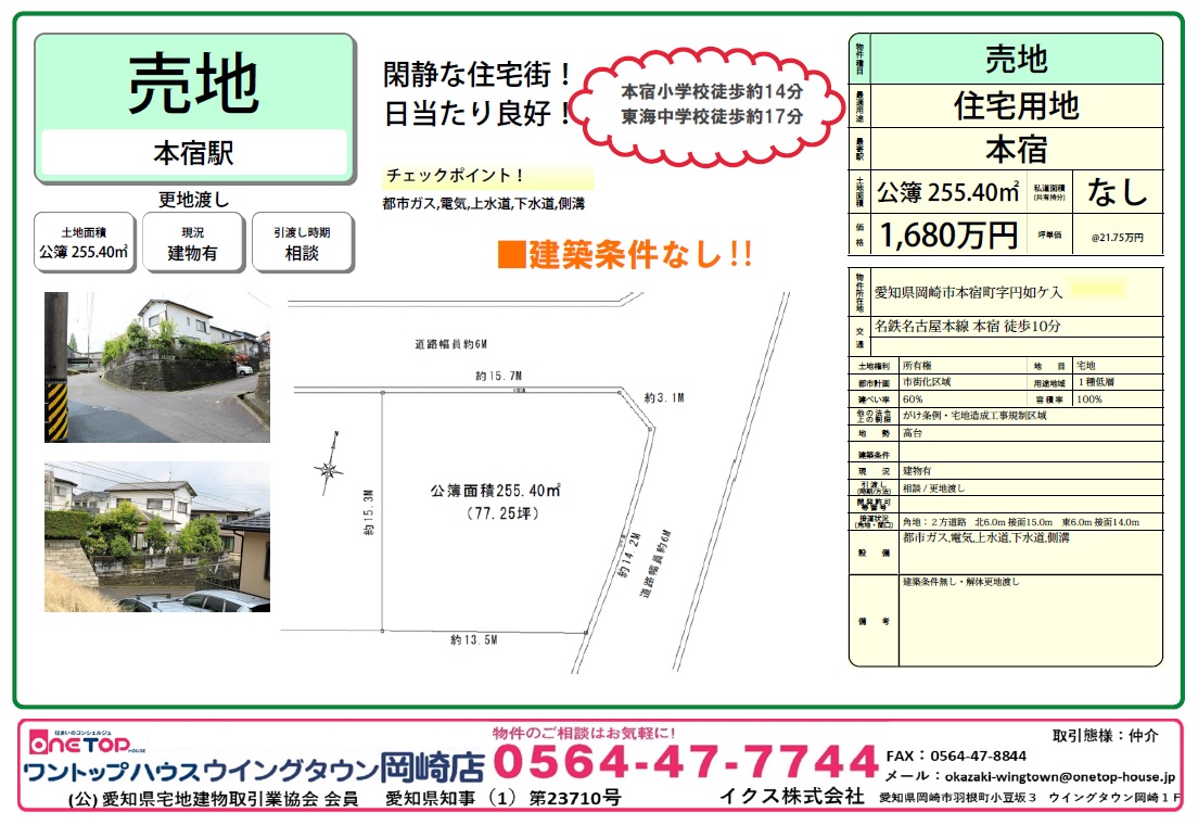 岡崎市土地紹介 建築条件無し 名鉄名古屋本線 本宿駅 本宿小学校 東海中学校