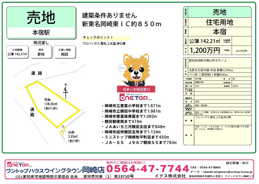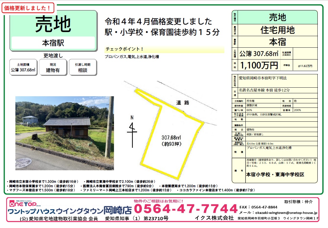 岡崎市土地紹介 建築条件無し 名鉄名古屋本線 本宿駅 本宿小学校 東海中学校 豊富小学校 額田中学校