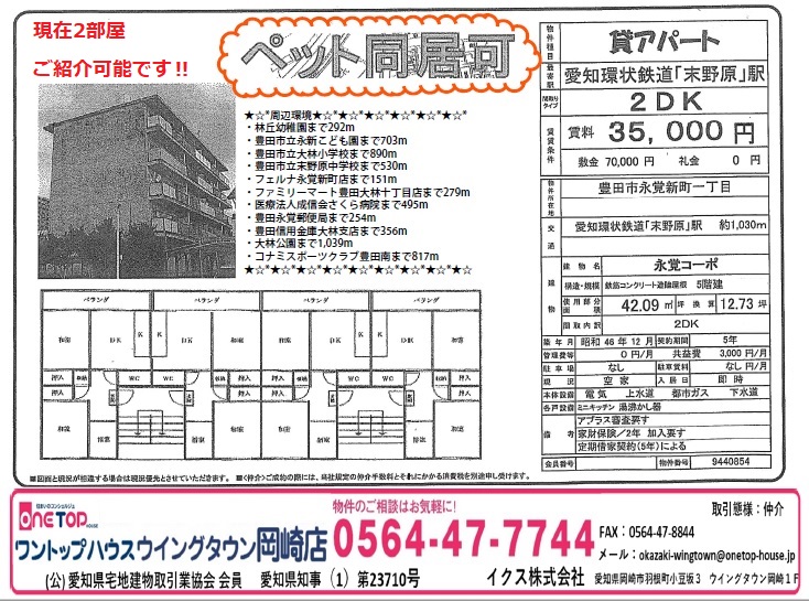 安城市 岡崎市 豊田市 刈谷市 幸田町 不動産 ワントップハウス ウイングタウン 土地 戸建 売買 賃貸 新築 中古 査定 相談無料 老人ホーム相談 手数料無料 豊田市賃貸 永覚新町 永覚コーポ バス・トイレ別 バルコニー