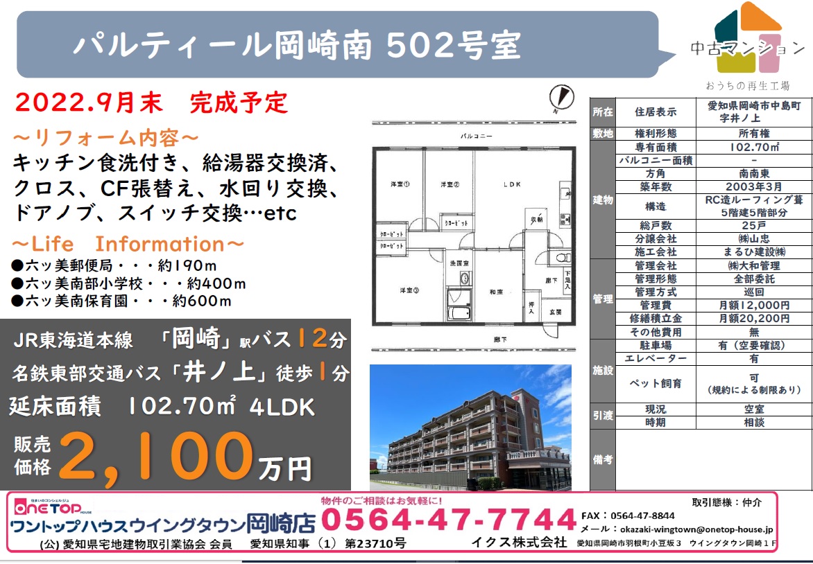 ワントップハウスウイングタウン岡崎店より中古マンションのご紹介です!
