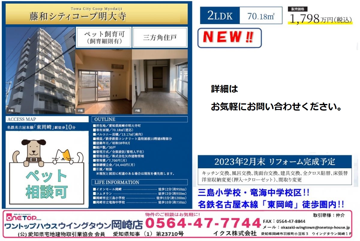 ワントップハウスウイングタウン岡崎店より新着物件のご紹介です!