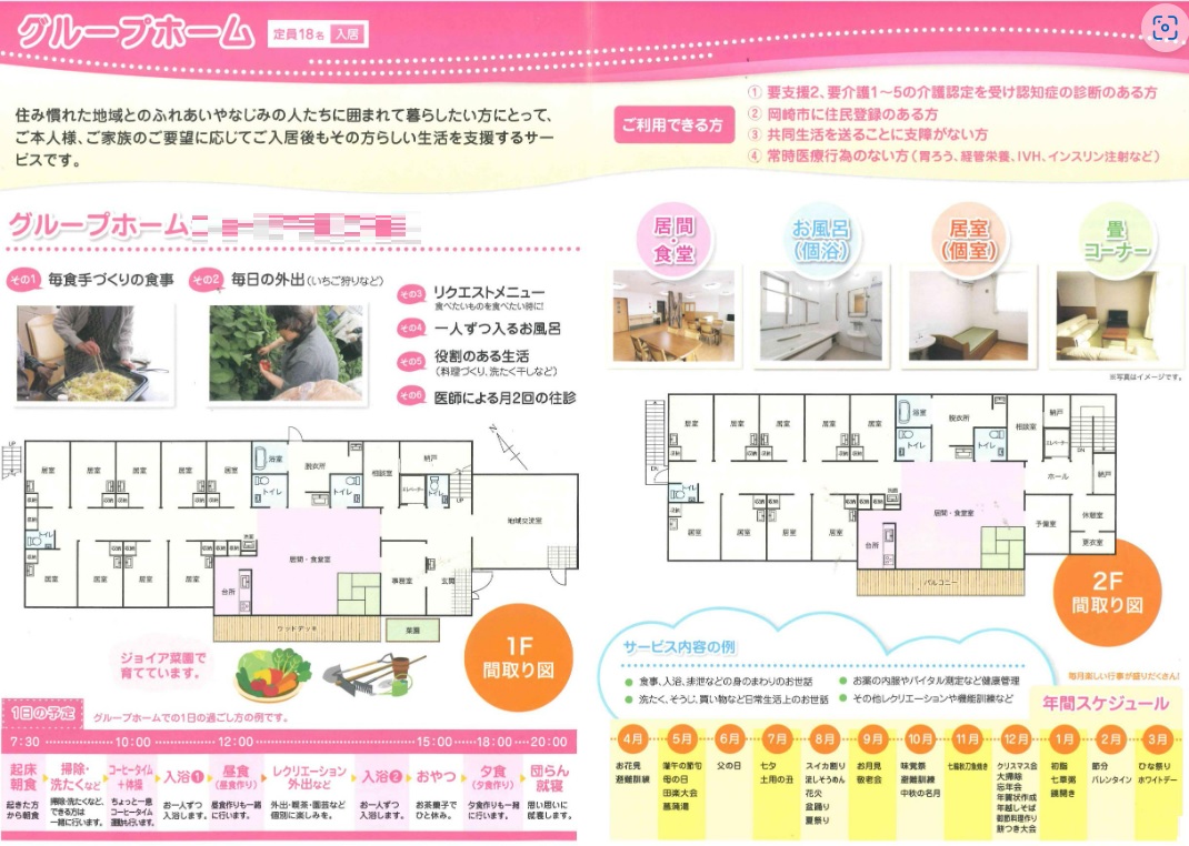 愛知県岡崎市宇頭町にあるグループホームです。おひとりおひとりを尊重し、個性やライフスタイルに合わせた介護をご提供いたします。9名ごとに分かれたユニット制ですので、こじんまりと家庭的な雰囲気の中で過ごせます。定期的にイベントやレクリレーションを開催しております。