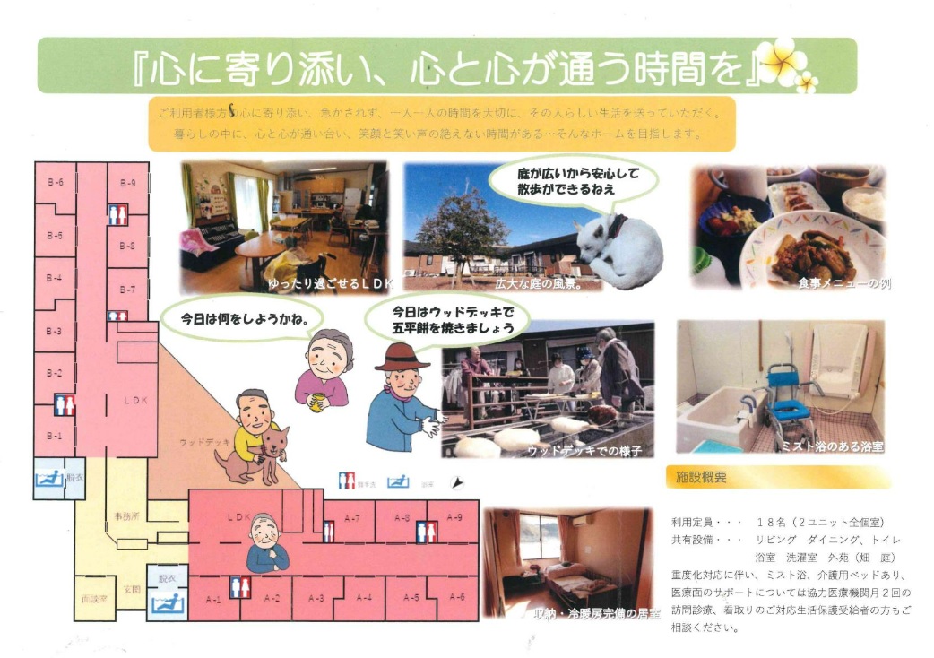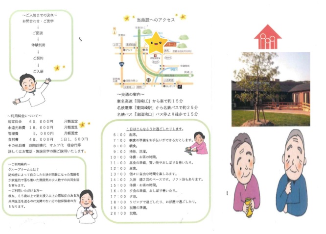 愛知県岡崎市滝町にあるグループホームです。施設内は家庭的な雰囲気が特徴です。生活のなかで認知症進行予防のリハビリを行っております。お食事は、栄養バランスを考慮したメニューをご提供しております。定期的に季節のイベントやレクリレーションを開催しております。
