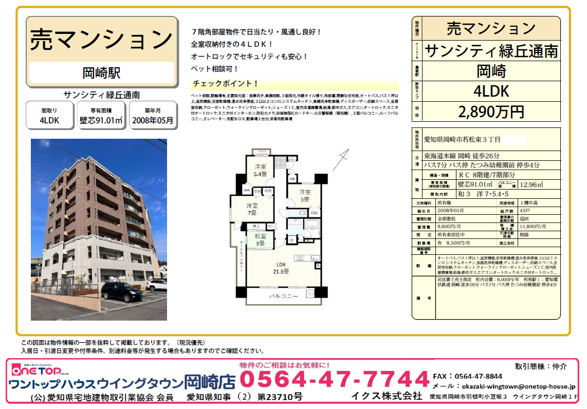 ワントップハウスウイングタウン岡崎店よりマンションのご紹介です!