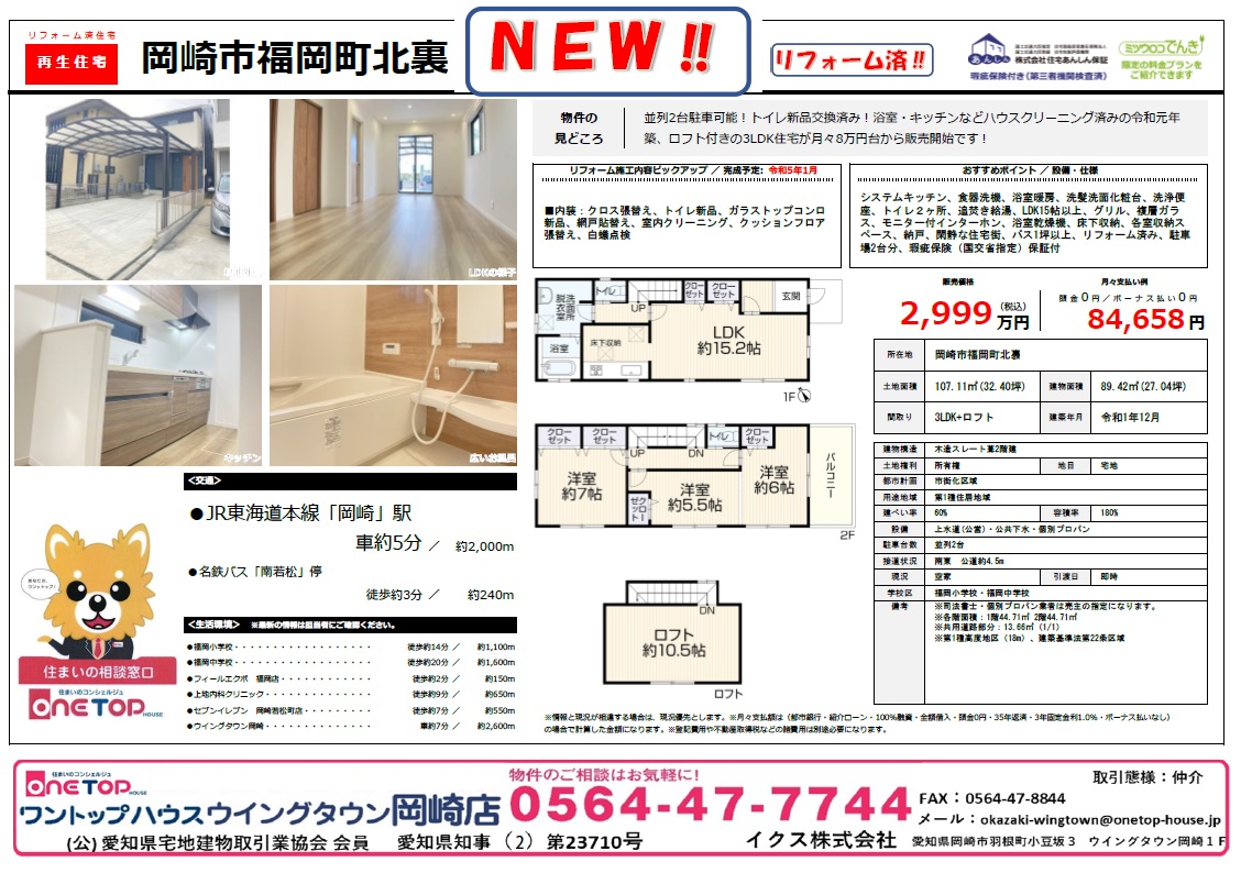 ワントップハウスウイングタウン岡崎店より【新着物件】のご紹介です!