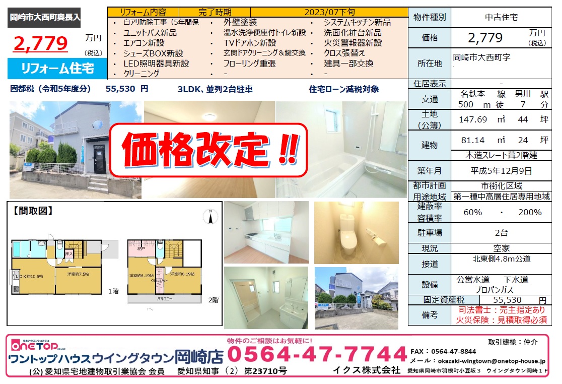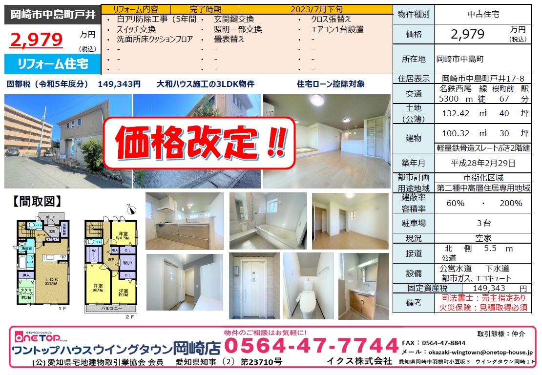 ワントップハウスウイングタウン岡崎店より価格改定のご紹介です!