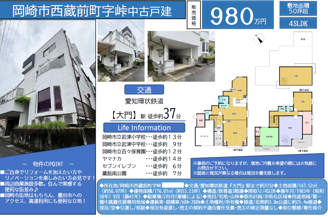 【中古戸建】岡崎市西蔵前町 4SLDK 980万円