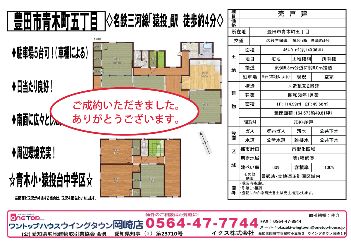 このたび、【中古戸建】豊田市青木町5丁目、ご成約いただきました